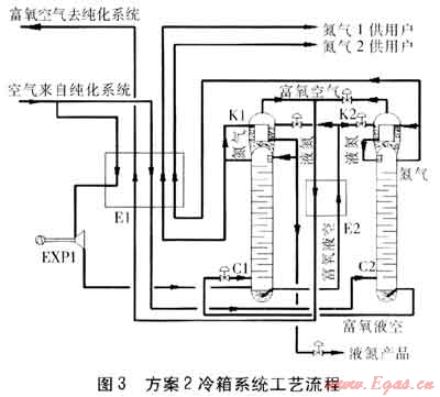 在C1底部產(chǎn)生的富氧液空經(jīng)E2過冷,節(jié)流后進入C2進行二次精餾,得到產(chǎn)品氮氣經(jīng)E2、E1復(fù)熱后作為氮氣1供用戶。得到富氧空氣經(jīng)E2復(fù)熱,進入E1被復(fù)熱到約-145℃后,送入EXP1膨脹制冷后,返回E1被復(fù)熱后,送入純化系統(tǒng)。
