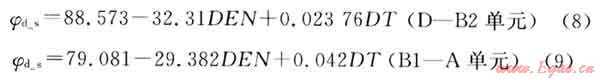 該氣田陵三段巖心孔隙度隨巖石顆粒密度變化明顯,這正是儲(chǔ)層微觀非均質(zhì)性的表現(xiàn)。因此常規(guī)簡(jiǎn)單孔隙度計(jì)算模型,如密度孔隙度采用砂巖密度2.65g/cm3這一固定值計(jì)算誤差勢(shì)必較大,為此孔隙度評(píng)價(jià)需要建立在對(duì)于不同流動(dòng)單元儲(chǔ)層特性的基礎(chǔ)之上,進(jìn)行類別劃分,才能確定準(zhǔn)確的孔隙度評(píng)價(jià)模型。通過研究,將陵三段6個(gè)流動(dòng)單元大致分為2類,選取與巖心孔隙度關(guān)系較好的密度、聲波時(shí)差曲線作為建模曲線,最終確定基于流動(dòng)單元的孔隙度評(píng)價(jià)模型為:
