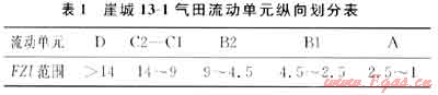 以巖心分析的孔隙度和滲透率數(shù)據(jù)以及測(cè)井?dāng)?shù)據(jù)為基礎(chǔ),按FZI法計(jì)算各井點(diǎn)的FZI值,并參考地層測(cè)壓、測(cè)試資料等,分出6個(gè)流動(dòng)單元(表1)。