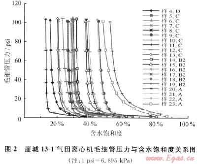 氣田采用低侵巖心Dean-Stark技術(shù)提取的巖心原始地層水礦化度比從Y4井水層測(cè)試產(chǎn)的水要淡,這使得在測(cè)井解釋中使用的礦化度是否正確成為一個(gè)重要問題。此外,嚴(yán)重的鉆井液侵入(探井)及大量巖心測(cè)量的電阻率參數(shù)也存在較大差異。這些不確定因素導(dǎo)致在利用模型1)計(jì)算含水飽和度時(shí)存在許多爭(zhēng)議性的問題,而且該模型無法直接應(yīng)用到地質(zhì)建模及油藏?cái)?shù)字模擬,因此需要建立一個(gè)非電法飽和度模型。氣田A1、A2開發(fā)井全井段油基鉆井液密閉心飽和度資料及一定的毛細(xì)管壓力實(shí)驗(yàn)資料為這類模型的研究提供了基礎(chǔ)。但同時(shí)又出現(xiàn)了另一個(gè)問題,即所有開發(fā)井巖心分析含水飽和度都是束縛水飽和度,因?yàn)樗鼈兌几哂跉馑缑?,因此在建立非電法模型時(shí)需要考慮這些因素。