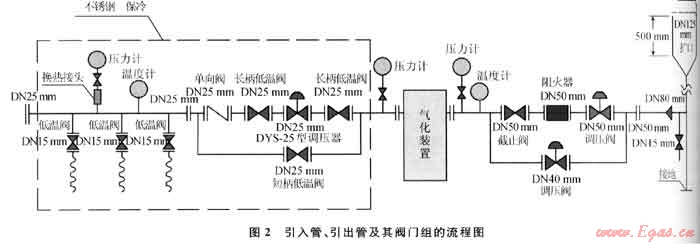 每個貯液罐的出口處均裝有公稱直徑為15mm的低溫球閥,閥后均用公稱直徑為15mm的金屬軟管與工質(zhì)引入管連接,引入管的一端封死,另一端連接在上盤管進口集箱的下封蓋上。引入管上裝有閥門組,起到阻止低溫工質(zhì)回流、截止管路流通和調(diào)節(jié)管道壓力等作用。引出管上也裝有閥門組,同樣起到截止管路流通和調(diào)節(jié)管道壓力等作用,其流程圖如圖2所示(圖2中所示LNG加熱氣化裝置的左側(cè)為引入管閥門組的流程圖,右側(cè)為引出管閥門組的流程圖)。引出管閥門組后裝有阻火器,以防室外雷電等回火進入裝置。阻火器后的引出管管徑擴大為80mm,沿實驗室外墻升到屋頂上空,將氣化后的天然氣排入大氣。為消除排氣引起的噪音,排氣管道末端裝有擴口消音器,并裝有避雷針,防止雷擊。