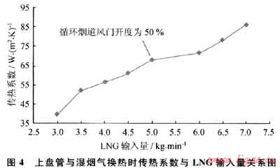 圖4為上盤管與濕煙氣換熱時傳熱系數(shù)與LNG輸入量的關(guān)系圖。反映了當(dāng)燃料天然氣輸入熱負(fù)荷不變、循環(huán)煙道調(diào)風(fēng)門的開度為50%時,濕煙氣與上盤管換熱的傳熱系數(shù)與LNG輸入量之間的關(guān)系,此時上盤管外濕煙氣量基本不變,傳熱系數(shù)的變化主要由管內(nèi)LNG的對流換熱系數(shù)決定。隨著LNG輸入量的增大,其管內(nèi)流速上升,導(dǎo)致上盤管傳熱系數(shù)增大,且隨著LNG輸入量的增大,在輸入熱負(fù)荷不變時,其溫升下降,從而增大了管內(nèi)外的傳熱溫差,促進了傳熱。