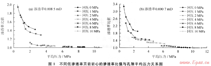 兩塊實(shí)驗(yàn)巖樣取自頁巖氣層,滲透率分別為0.0085mD和0.0007mD。實(shí)驗(yàn)過程中通過增加巖樣出口的回壓來模擬不同儲(chǔ)層孔隙壓力條件下氣體的滲流特征,回壓由初始的0.1MPa逐次增加到1MPa、2MPa、4MPa、6MPa、8MPa和10MPa,實(shí)驗(yàn)過程中計(jì)算并繪制不同回壓狀態(tài)下對(duì)應(yīng)的氣體滲流特征曲線 (圖1)??梢钥闯觯涸诘涂紫秹毫?小于1MPa)條件下,氣體在巖樣中的滑脫效應(yīng)顯著;隨著孔隙壓力增加,氣體在巖樣中的滑脫效應(yīng)明顯減弱,當(dāng)孔隙壓力達(dá)到6MPa時(shí),氣體滑脫效應(yīng)引起的滲透率增加值已經(jīng)不足5%;當(dāng)孔隙壓力繼續(xù)增加到8MPa以上時(shí),氣體滑脫效應(yīng)引起的滲透率增加值已經(jīng)小于1%,可見儲(chǔ)層孔隙壓力大小直接決定了氣體滲流過程中滑脫效應(yīng)的強(qiáng)弱,如果儲(chǔ)層孔隙壓力大于1OMPa,那么頁巖氣藏開發(fā)過程中就沒有必要考慮滑脫效應(yīng)對(duì)于氣井產(chǎn)能和生產(chǎn)壓力的影響。換算到地層條件下就是如果氣藏壓力系數(shù)等于1,那么深度大于1000m的氣藏開發(fā)就可以不必考慮滑脫效應(yīng)的影響;如果氣藏壓力系數(shù)等于0.5,那么深度大于2000m的氣藏開發(fā)就不受滑脫效應(yīng)的影響,但是對(duì)于1000m的氣藏,滑脫效應(yīng)對(duì)于氣藏的開發(fā)效果有一定的影響,這種影響對(duì)于產(chǎn)能極低的頁巖氣藏來講是不可忽視的。