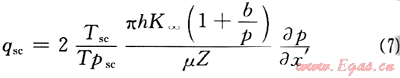 由圖6及式(11)可以看出:滑脫系數(shù)(b)越大,供給邊界壓力(pe)越小,參數(shù)ε越大,氣體滑脫對(duì)氣井生產(chǎn)影響越大;當(dāng)邊界壓力(pe)較低時(shí)(如pe≤5MPa),參數(shù)e受滑脫系數(shù)(b)影響較大,氣體滑脫效應(yīng)對(duì)氣井生產(chǎn)影響較大;而當(dāng)邊界壓力(pe)較大時(shí)(如pe≥10MPa),參數(shù)ε受滑脫系數(shù)(b)影響較小,氣體滑脫效應(yīng)對(duì)氣井生產(chǎn)影響較小,小于10%。這一計(jì)算結(jié)果與室內(nèi)巖心滲流實(shí)驗(yàn)結(jié)果也是完全一致的,說明低滲氣藏儲(chǔ)層滑脫效應(yīng)決定于孔隙壓力大小的結(jié)論是正確的。