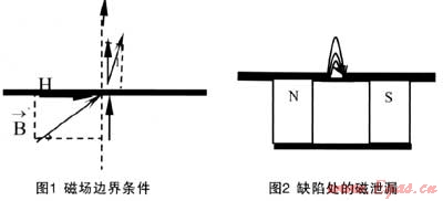 由上述理論可導(dǎo)出,當(dāng)磁場(chǎng)由磁導(dǎo)率大的介質(zhì)穿出到磁導(dǎo)率小的介質(zhì)中時(shí),磁場(chǎng)向法向發(fā)生偏轉(zhuǎn)。因此當(dāng)磁場(chǎng)在管壁上遇到缺陷時(shí)由于μ2遠(yuǎn)小于μ1。使得磁場(chǎng)在缺陷出溢出形成漏磁信號(hào)。