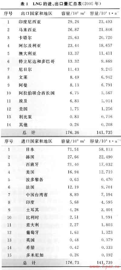 2003年全球天然氣消費量為2.6×1012m3/a,至2006年持續(xù)以1.8%的比例增加,其后又以每年2.8%的比例增長,預(yù)計2025年全球天然氣消費量將達(dá)5.1×1012m3/a。在天然氣貿(mào)易量中有7%是通過LNG的方式來進(jìn)行的,表1反映了世界LNG進(jìn)出口國家和地區(qū)的進(jìn)出口量[1]。