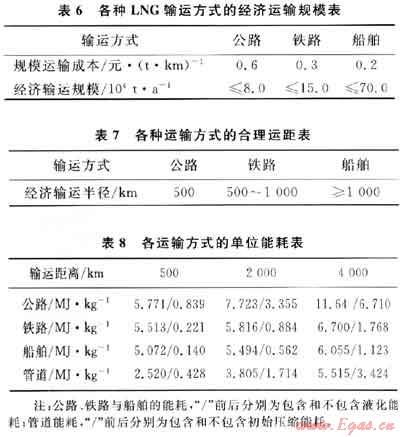根據(jù)相關(guān)資料測算,得到各種運輸方式在不同運輸距離下,輸送單位質(zhì)量LNG的一次能源(換算成天然氣)消耗量如表8所示[4]。