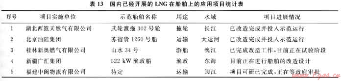 2009年4月,全球首套LNG船用燃料儲存供氣系統(tǒng)由張家港富瑞特種裝備股份有限公司下屬的控股子公司張家港韓中深冷科技有限公司研發(fā)試制成功并順利交付客戶挪威漢姆沃斯公司。同時,在國內(nèi)LNG船舶油改氣項目也有了長足的發(fā)展。截至目前,已經(jīng)先后有湖北西籃、北京油陸、桂林新奧燃?xì)?、新疆廣匯、福建中閩等多家能源企業(yè)為了搶占LNG在船舶領(lǐng)域的應(yīng)用市場而開展了船舶燃料油改氣示范項目的運作(表13)。