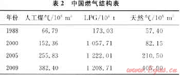 我國將天然氣發(fā)展視為一項能源結(jié)構(gòu)調(diào)整和大氣環(huán)境改善的重要舉措。中國城市燃?xì)膺M(jìn)入了天然氣階段,20世紀(jì)90年代末至21世紀(jì)初,中國建設(shè)了一批天然氣輸送工程,推動了城市燃?xì)獾陌l(fā)展——城市燃?xì)馄占奥侍岣摺⑷細(xì)饨Y(jié)構(gòu)發(fā)生了很大變化(表2)[3]。