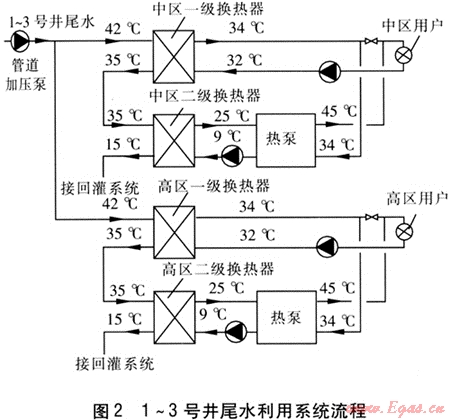 1~3號井尾水混合后的溫度約42℃,經(jīng)兩次換熱后回灌。中區(qū)與高區(qū)并聯(lián),均通過一級換熱器提供基礎(chǔ)負荷,不足部分負荷由熱泵提供。地?zé)崴毓鄿囟燃s15℃。