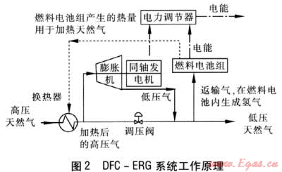 近年來,美國、英國一些公司將膨脹機技術(shù)與其他技術(shù)聯(lián)合,以回收調(diào)壓過程中的壓力能,研究工作取得了一定進展。2008年10月,北美Enbridge公司將膨脹機與燃料電池組合在一起形成DFC-ERG系統(tǒng)[6],并在加拿大多倫多門站進行了現(xiàn)場試驗,該聯(lián)合裝置的發(fā)電功率為2200kW。DFC-ERG系統(tǒng)工作原理見圖2。