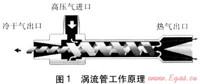 以只輸入一定壓力的壓縮空氣為例,通過渦流管處理,一端產(chǎn)生冷空氣(在干燥空氣的前提下最低溫度可達-46℃),另一端產(chǎn)生熱空氣(最高溫度可達127℃)。利用冷、熱端氣體溫度的不同,可分別提供制冷或加熱,使能量得到充分利用。渦流管制冷效果介于節(jié)流閥和膨脹機之間。