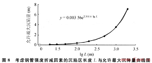 2) 根據(jù)《輸氣管道工程設(shè)計(jì)規(guī)范》[3]的有關(guān)規(guī)定,在輸氣管道系統(tǒng)中,支管道沒有軸向約束(如固定支墩或其他錨固件)時(shí),使管道附件產(chǎn)生的彎曲應(yīng)符合公式:σe≤0.72σs(σe為組合應(yīng)力;σs為管道的最低屈服強(qiáng)度),按假設(shè)受力模型的簡化分析和采用的算例,X70鋼管屈服強(qiáng)度為485MPa,則0.72σs=349.2MPa,可得管道通過不同長度沉陷區(qū)的允許最大沉陷量和其回歸方程(圖8)。