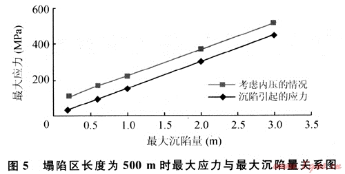 1) 按假設(shè)受力模型的簡化分析和所采用的計(jì)算方法,X70鋼管屈服強(qiáng)度為485MPa,并以此作為管道遭遇危險(xiǎn)的判定標(biāo)準(zhǔn),在不考慮鋼管強(qiáng)度的折減因素前提下,可得管道通過不同長度沉陷區(qū)的允許最大沉降量,并用最小二乘法建立了管道允許最大沉陷量與沉陷區(qū)長度的回歸方程,結(jié)果如圖7所示。