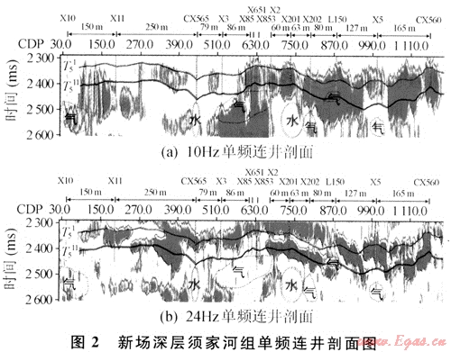地震波在含氣儲層和含水儲層中傳播時,振幅、頻率和能量等動力學(xué)屬性將會發(fā)生變化。但是,兩者的變化程度可能存在差異,且在時間域內(nèi)卻很可能難以發(fā)現(xiàn)。時頻分析技術(shù)可以將時間域的地震信號變換到時間-頻率域進(jìn)行解釋,在時間-頻率域內(nèi)突出含氣儲層和含水儲層之間的地震響應(yīng)差異。將該方法應(yīng)用到川西坳陷深層須家河組氣藏的含氣性檢測中,在時頻域內(nèi)利用“低頻陰影”、“高頻衰減”等含氣響應(yīng)特征,對含氣儲層和含水儲層進(jìn)行了有效區(qū)分。