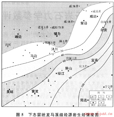 根據(jù)區(qū)內(nèi)烴源巖情況,選用殘余有機碳法計算烴源巖的生烴強度。區(qū)內(nèi)4套烴源巖的平均生烴強度計算結(jié)果分別為:下寒武統(tǒng)筇竹寺組為63×108m3/km2、下志留統(tǒng)龍馬溪組為44.5×108m3/km2、下二疊統(tǒng)為11.5×108m3/km2、下三疊統(tǒng)嘉陵江組為0.85×108m3/km2。各烴源層生烴強度的展布特征如下:下寒武統(tǒng)筇竹寺組烴源巖生烴強度高值區(qū)位于工區(qū)北東側(cè)的榮縣-威遠(yuǎn)-自貢一帶,最大生烴強度為100×108m3/km2,平均生烴強度位于珙縣-屏山-犍為-樂山一帶(圖4);下志留統(tǒng)龍馬溪組烴源巖生烴強度高值區(qū)位于工區(qū)東南側(cè)的宜賓-筠連一帶,最大生烴強度為100×108m3/km2,平均生烴強度位于美姑-綏江-自貢一帶(圖5)。