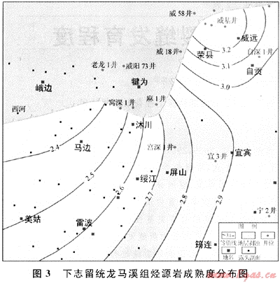 平面上,各層系烴源巖成熟度變化仍然較大:①下寒武統(tǒng)筇竹寺組烴源巖折算鏡質(zhì)體反射率最大,其烴源巖成熟度分布范圍為1.66%~4.31%,平均達(dá)2.5%,表明烴源巖已達(dá)過成熟階段,以產(chǎn)干氣為主。工區(qū)北側(cè)的犍為-樂山一帶烴源巖成熟度高,均已超過3.0%,西側(cè)的美姑-西河一帶烴源巖成熟度相對較低,約為2.1%,工區(qū)東南側(cè)的屏山-長寧-珙縣一帶烴源巖成熟度也相對較低,小于2.1%。②下志留統(tǒng)龍馬溪組烴源巖成熟度分布具有東側(cè)高西側(cè)低的特點,且烴源巖演化程度較高為2.4%~3.2%,平均達(dá)2.8%,烴源巖處于高成熟過成熟階段,以生氣為主。西側(cè)馬邊-陳子巖一帶烴源巖成熟度相對較低,約為2.4%(圖3)。③下二疊統(tǒng)烴源巖成熟度較高,為2.0%~2.7%,平均2.35%,烴源巖處于高成熟-過成熟階段,以生氣為主。在峨邊-樂山-威遠(yuǎn)一帶烴源巖演化成度相對較低,為2.0%~2.1%;而工區(qū)南側(cè)和東南側(cè)的宜賓-屏山-雷波一帶烴源巖演化程度較高,為2.6%~2.7%。④下三疊統(tǒng)嘉陵江組烴源巖在各層系中成熟度最低,為1.0%~1.6%,平均為1.35%,烴源巖處于高成熟階段,以產(chǎn)濕氣為主,可產(chǎn)少量凝析油。