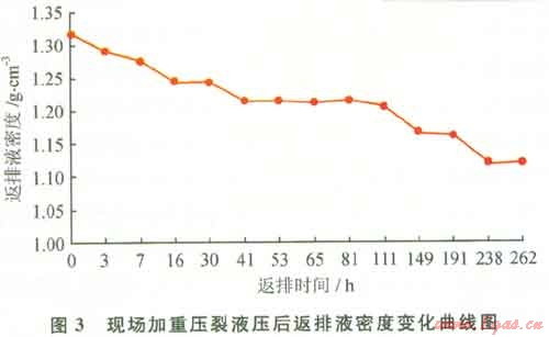 以某高溫高壓氣井使用加重壓裂液施工為例,該井氣層井深5300m,地層溫度145℃。采用40%加重劑加重瓜膠壓裂液,其密度達(dá)1.32g/cm3。在最大泵壓88 MPa下注入地層總液量632.5m3和陶粒42.8m3。該氣井壓裂后獲得高產(chǎn)氣流,增產(chǎn)效果顯著。但現(xiàn)場監(jiān)測壓裂后返排出地面液體性能表明,壓后液體破膠較徹底,返排液體黏度在3mPa·s。左右,但返排液體密度比壓裂前液體密度低0.1~0.2g/cm3,且隨返排時間增加返排出的液體密度逐漸下降(圖3)。表明該井在儲層增產(chǎn)作業(yè)過程中已產(chǎn)生了部分鹽析造成鹽分丟失,使得壓后返排液體密度下降。在該地區(qū)采用相同加重壓裂工藝改造的氣井普遍存在類似現(xiàn)象。