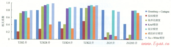圖2 各種模型實(shí)測(cè)橫波與預(yù)測(cè)橫波相關(guān)系數(shù)圖