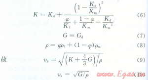 式中K為飽含孔隙流體巖石的等效體變模量;G為飽含孔隙流體巖石的等效剪切模量;ρ為飽含孔隙流體巖石的等效密度;Kd為巖石骨架體變模量;Gd為巖石骨架剪切模量;Km為巖石基質(zhì)體變模量;ρm為巖石基質(zhì)的密度;Kf為孔隙流體的體變模量.ρf為飽含流體的密度;φ為巖石孔隙度;νp為飽含孔隙流體巖石的縱波速度;νs為飽含孔隙流體巖石的橫波速度。