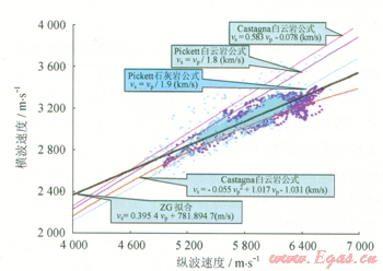 圖1 經(jīng)驗(yàn)公式與實(shí)測(cè)縱、橫波數(shù)據(jù)關(guān)系圖