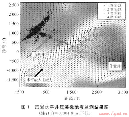 常規(guī)壓裂形成的裂縫一般呈雙翼對(duì)稱裂縫的形式。但頁巖氣壓裂中微地震監(jiān)測(cè)的結(jié)果表明,裂縫的形態(tài)復(fù)雜多變,如圖1所示[2]。1口水平井壓裂后微地震監(jiān)測(cè)結(jié)果表明,第1、2段壓裂施工形成了垂直于水平井段的平面縫,第3、4段施工形成了網(wǎng)狀裂縫。目前認(rèn)為頁巖氣壓裂目的,就是要建立一個(gè)獨(dú)立于傳統(tǒng)意義裂縫半長(zhǎng)的更加龐大的裂縫網(wǎng)絡(luò)系統(tǒng),實(shí)現(xiàn)更大規(guī)模的儲(chǔ)層改造波及體積;生產(chǎn)實(shí)踐也證明了儲(chǔ)層改造體積越大壓后增產(chǎn)效果越好。