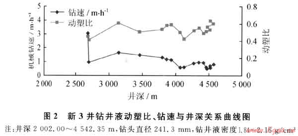 從實(shí)鉆資料可以看出(圖2),川西地區(qū)在3000m以前,提高鉆井液動(dòng)塑比有利于提高鉆井機(jī)械鉆速,但是隨著井深的增加,3000m以后,盡管鉆井液動(dòng)塑比有效提升,但是鉆井機(jī)械鉆速仍然很低,并且隨著井深的增加呈降低的趨勢(shì)。