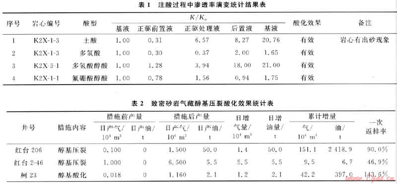 3) 醇基酸液性能研究表明,甲醇與酸液各種添加劑有良好的配伍性,醇酸具有很好的解除水鎖、促進(jìn)殘酸返排、降低二次傷害等作用。