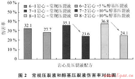 室內(nèi)對(duì)研制的醇基壓裂液性能進(jìn)行實(shí)驗(yàn)評(píng)價(jià),結(jié)果表明:①醇基壓裂液的表面張力低于26mN/m,低于水基壓裂液;②防膨率在80%以上,優(yōu)于水基壓裂液;③殘?jiān)繛?62mg/L,低于550mg/L的行業(yè)標(biāo)準(zhǔn);④用K2X井巖心實(shí)驗(yàn)醇基壓裂液的傷害率在23.65%~27.7%之間,而水基壓裂液的傷害率在32.1%~36.8%之間,可見(jiàn)醇基壓裂液傷害率比常規(guī)壓裂液降低幅度約1/3(圖2);⑤甲醇的加入有利于降低壓裂液的表面張力和黏度,從而有利于壓裂液施后的返排,降低了壓裂液對(duì)儲(chǔ)層的傷害。