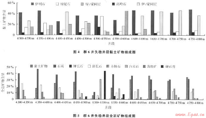 群6井是群庫恰克地區(qū)已完井中發(fā)生鉆井復雜事件最多的一口井,累計發(fā)生鉆井復雜事件49次,具有一定的代表性,研究中選取了群6井的失穩(wěn)井段(4300~4800m)巖屑進行礦物組分及其理化性能分析,黏土礦物和全巖礦物分析結(jié)果分別如圖4、5所示。