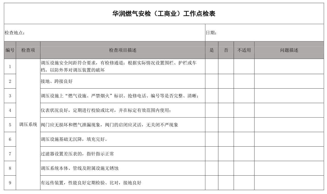 3 調(diào)壓設(shè)施上“燃氣設(shè)施、 嚴禁煙火” 標識、 搶修電話、 編號等是否完整、 清晰;