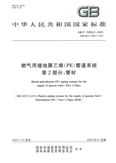 燃氣用埋地聚乙烯(PE)管道系統(tǒng) 第2部分:管材GB/T 15558.2-2023
